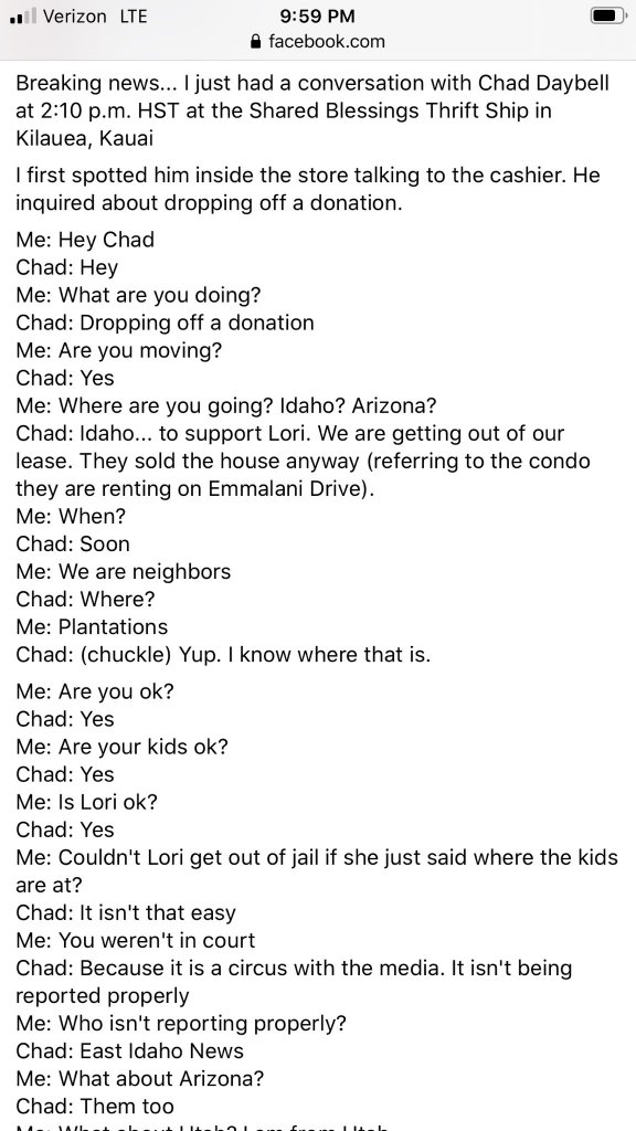 Okay, so the last time I was here, Lori was not arrested. Now she is and Chad has flown back to Idaho, right?