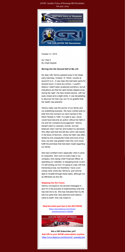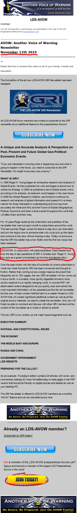 Private Members Only Forum: A Unique and Accurate Analysis & Perspective on Past, Present and Future Global Geo-Political-Economic Events from an LDS End-Times perspective. "If you are interested in knowing what is happening now and what is going to happen in the future, you need to subscribe to the GRI Newsletter.