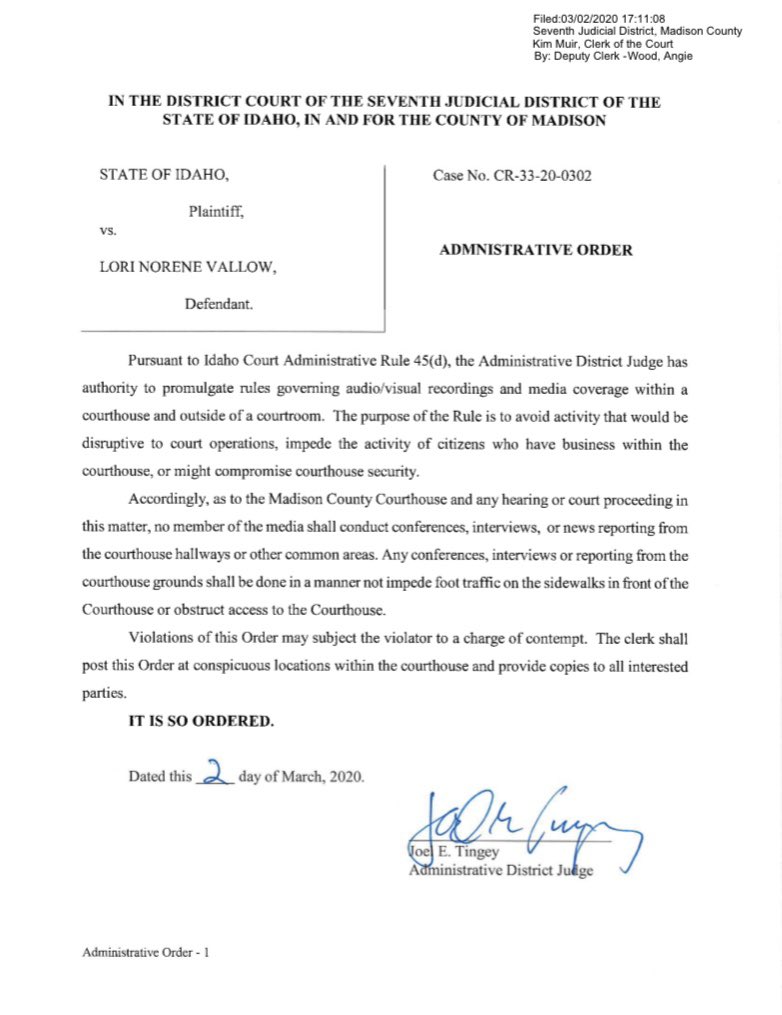 That is coming from the Idaho Court site. Not sure what the order is about. But if I had to hazard a guess it is an order related to media coverage in the courtroom.