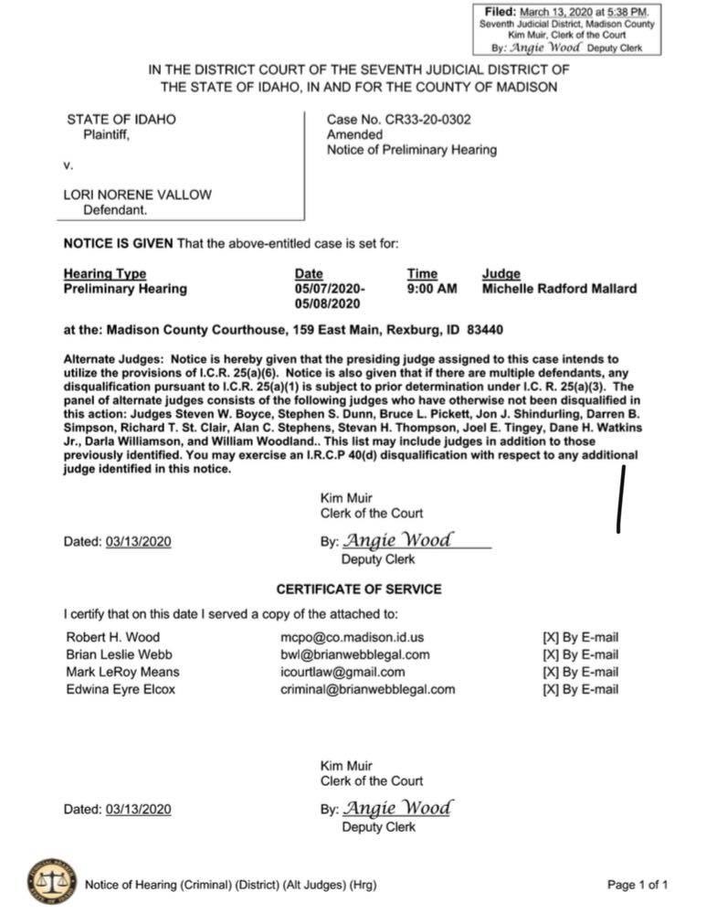 This is the amended notice of hearing showing Michelle Radford Mallard as judge over preliminary hearing for 5/7-5/8. It also lists the panel of alternate judges who have not be disqualified thus far.