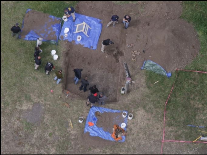 Also, as they were gathered round looking in the dig space and possible remains were already on tarp, why do you think there was so much interest in the dig space? What was left to see? Am I seeing it right that the dirt in that one area looked darker?