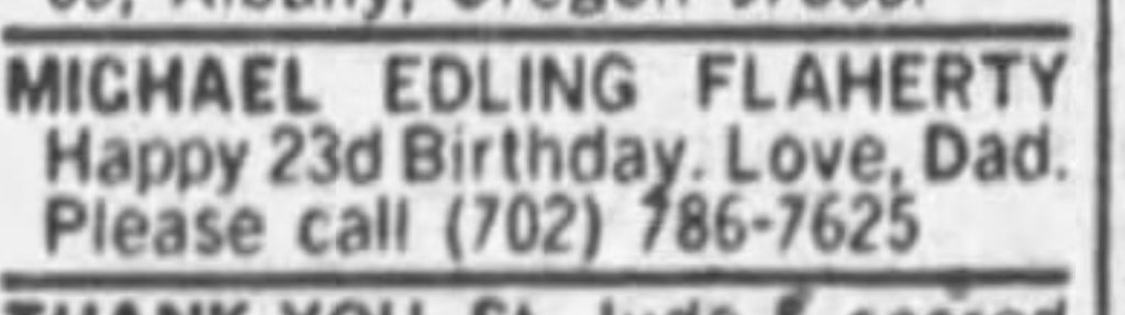 Flaherty was last seen in Cascade, Idaho on August 25, 1980. He has never been heard from again. He had a 30-30 rifle with him at the time. Few details are available regarding his disappearance and his whereabouts remain unknown.