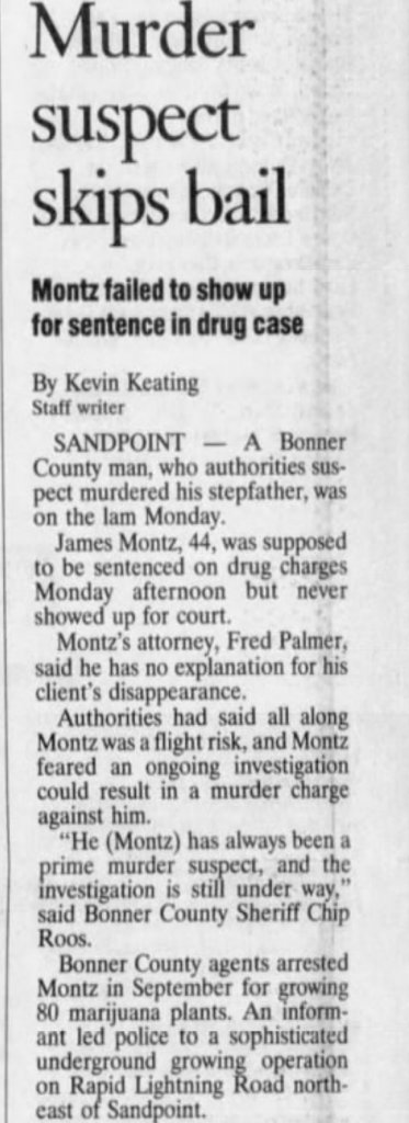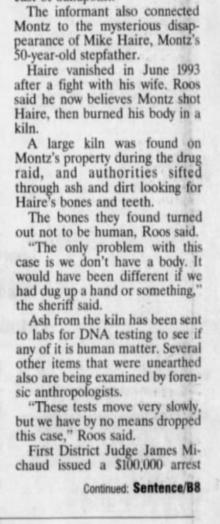 The prime suspect in the presumed homicide, James E. Montz, Haire's stepson, was arrested on unrelated charges in September 1994 after he was caught growing marijuana in an underground bunker. Authorities found a large kiln on his property and sifted through the ashes inside it, but didn't find any human remains.