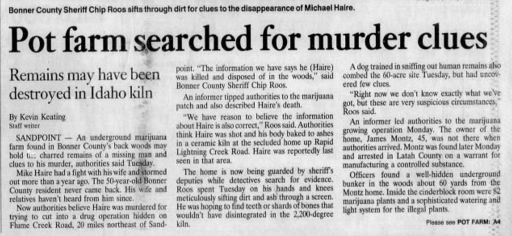 Haire was last seen in Bonner County, Idaho on June 19, 1993. He had an argument with his wife and angrily left and never returned. He has never been heard from again.