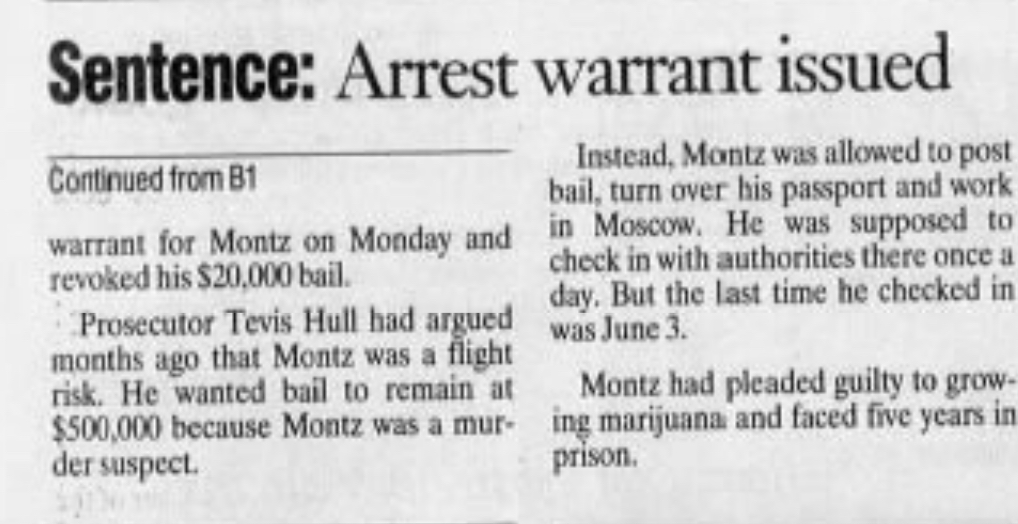 Montz pleaded guilty to the drug charges and faced up to five years in prison. He was supposed to appear in court for sentencing in June 1995, but he never showed up and hasn't been seen since. He is still at large.