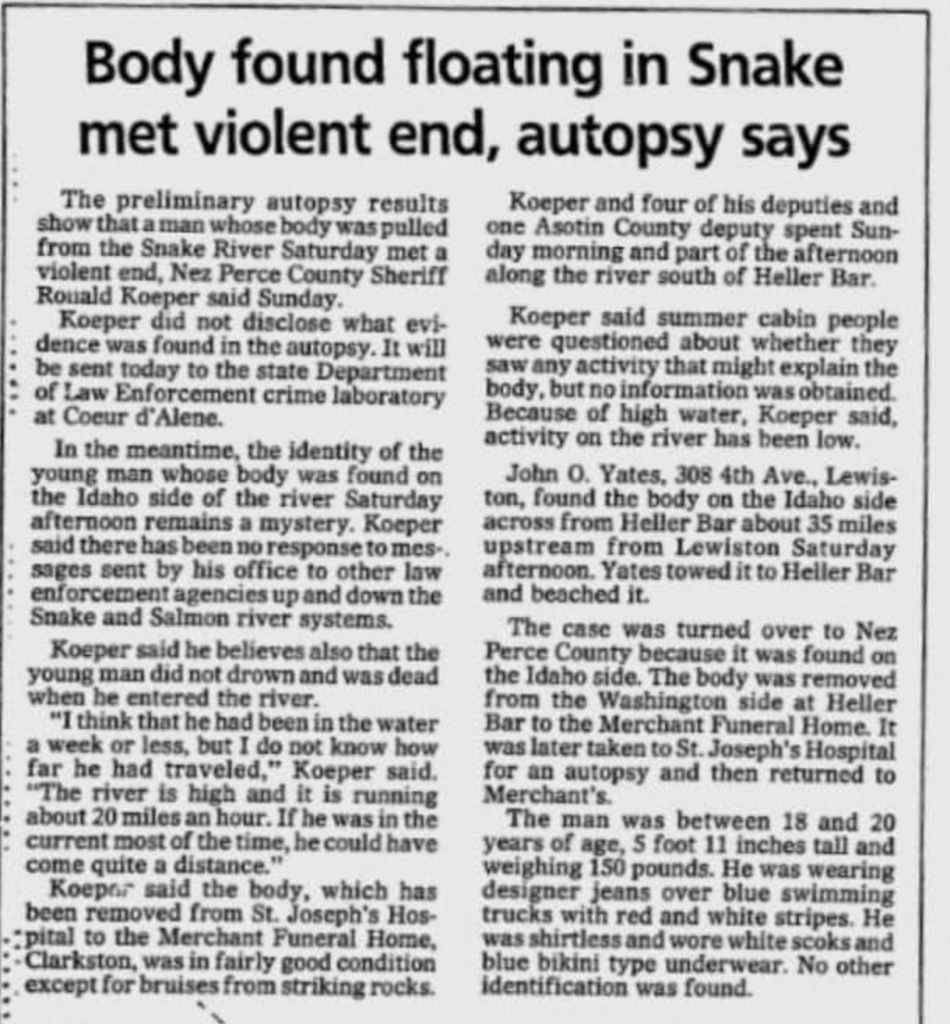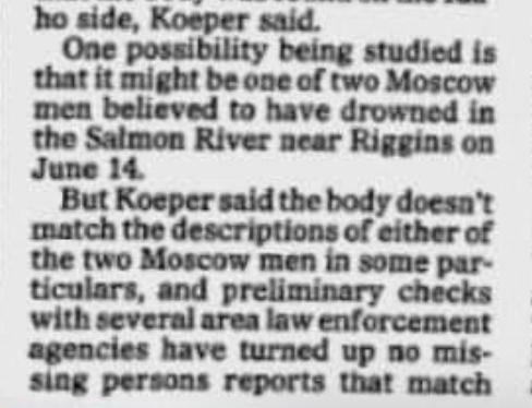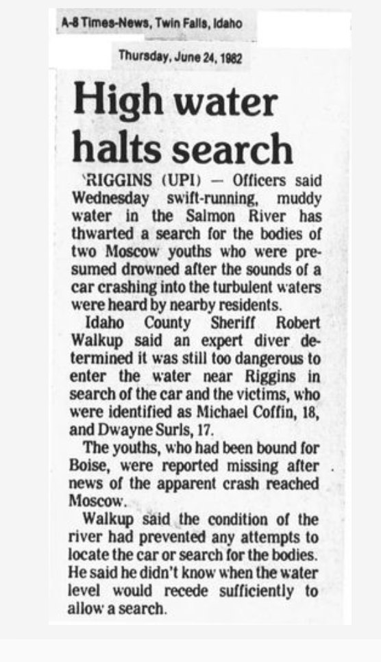 Also notable about this story is it’s dated June 24, 1982 - a whole ten days after the two youths disappearances - and it was still too dangerous to search the Salmon River. I wonder if was just as just as dangerous far upstream in the Snake River where Dewayne’s body was found.