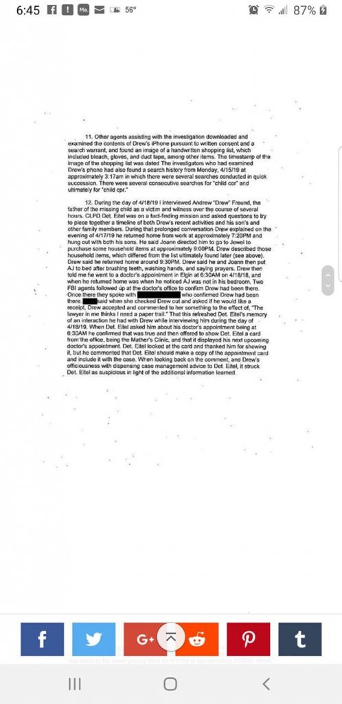 In addition to the early morning search for “child CPR” on April 15, investigators found a picture of a shopping list taken to the Crystal Lake Jewel-Osco store around 9 p.m. on April 17, which contained items including duct tape, plastic gloves, air freshener and bleach, according to the affidavit. Freund told police he purchased the bleach for cleaning, and the tape to hang photos. Freund said the family usually would go through a gallon of bleach each week.