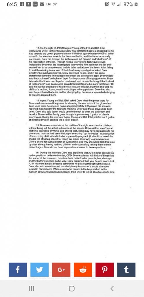 “Two FBI agents followed up at the doctor’s office to confirm Drew had been there. Once there, they spoke with [an employee] who confirmed Drew has been there,” Maldonado wrote. “[The employee] said when she checked Drew out and asked if he would like a receipt, Drew accepted and commented to her something to the effect of, ‘The lawyer in me thinks I need a paper trail.’ “