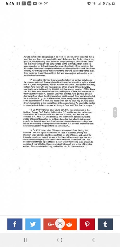 On April 19, investigators interviewed AJ’s younger brother at the McHenry County Child Advocacy center, Maldonado’s affidavit shows. The 4-year-old boy told interviewers his parents had told him not to talk about AJ, and said that his mother told him AJ had “fallen down the stairs and has a lot of owies,” Maldonado wrote.