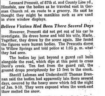 Prescott lived at 87th and County Line Rd. which was 1/2 mile from where the bodies were found. Prescott went "looking for clues" a few weeks after the discovery and managed to find a wallet and some other items in an area police had thoroughly searched earlier.