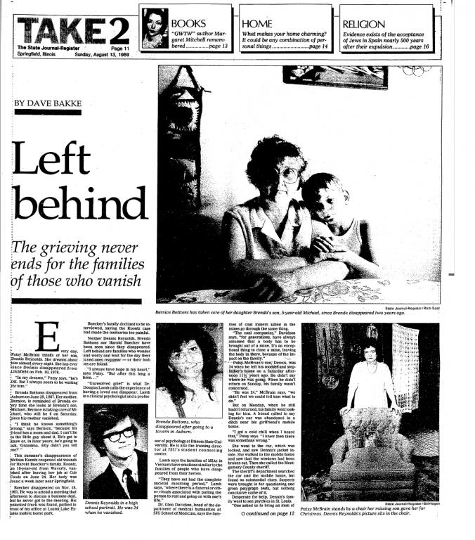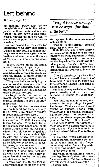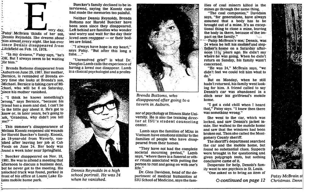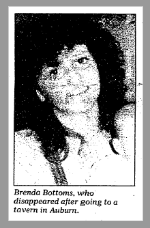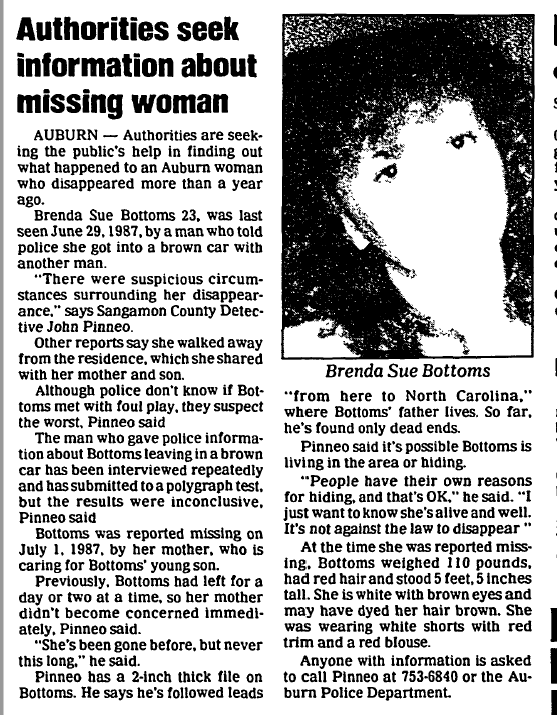 Circumstances: Bottoms, 23, left her Auburn home for a nearby tavern and never came back June 29, 1987. One of the best leads the Sangamon County Sheriff's Office had was from a witness who said he saw her get into a brown car with two men that night.