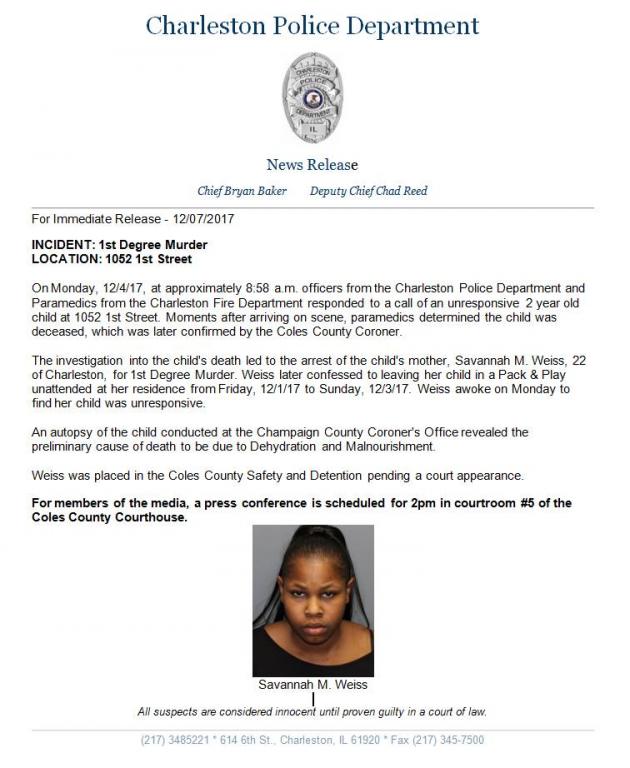 Savannah Weiss, 22, of Charleston was arrested after her 2-year-old son was left unattended for three days, according to a news release from the Charleston Police Department. Police said paramedics found the child dead in the home, and Weiss confessed to leaving him in a Pack-n-Play playpen unattended from Friday to Sunday.