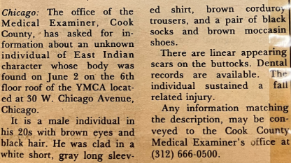 CIrcumstances now reads "Unknown male discovered on the sixth-floor roof of the YMCA."