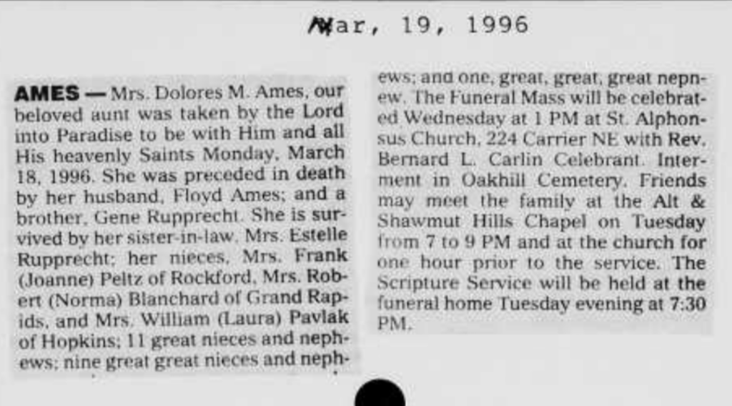 I think the GR in the 1996 obituary is a different GR. The obituary is for a woman old enough to have numerous great great neices/nephews and one great, great, great nephew. A brother of this woman would be much older than the GR who wrote the ad.