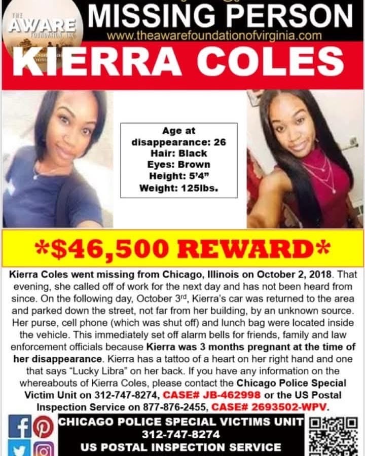 "Activists raised the reward money to $68,000 for information on the whereabouts of Kierra Coles, who was last seen on Oct. 2, 2018 near 83rd and King Drive. Coles’ car was found parked on her block with her purse and cell phone still inside."
