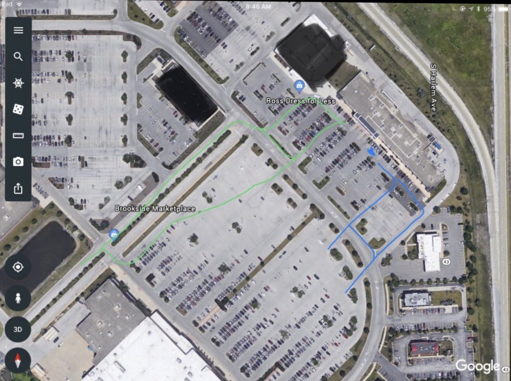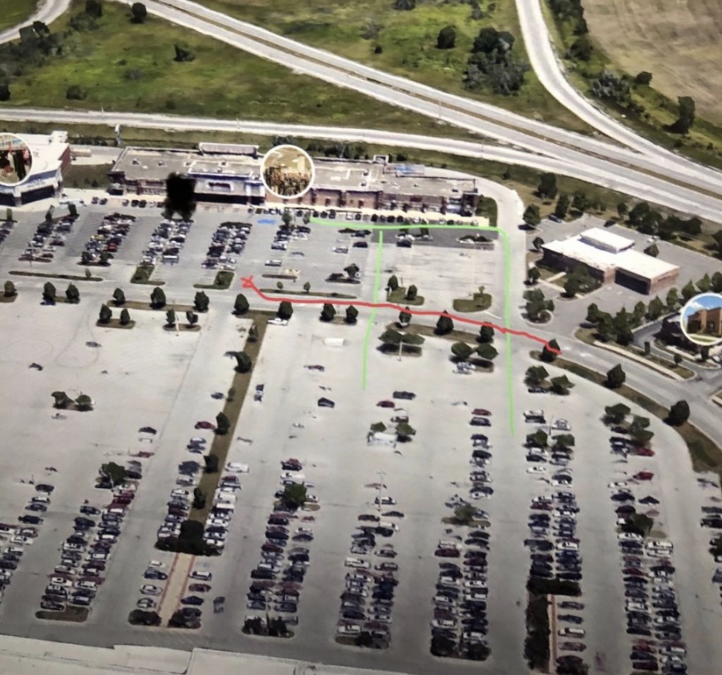I think it’s option 2. I drew a diagram of all the ways he could have left. The green is the way that I would leave the lot if I was in a hurry. The black dot is approximately where the suv of interest was parked. This parking lot is a maze when you first start shopping at this center. Whoever was driving knew it. I don’t think the face we see is the driver though.