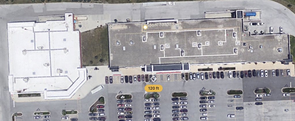 I was able to measure the distance from around where the breakroom would be to about where he would enter a car parked where the suv of interest was. The side of the building is 100 ft.