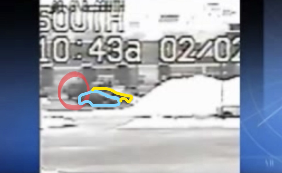 I see the car. Thank you, I’ve been wondering what small sedan they were referring to. It shows up first at the 10:40 time stamp, it’s still there at 10:43, and it’s gone by 10:45. We don’t have a 10:44 time stamp.