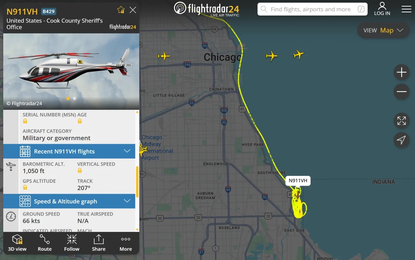 Upon further sleuthing, I think this is totally unrelated, so pls DISREGARD.Looks like a police helicopter is doing some laps around a particular spot along the shoreline just south of Chicago.