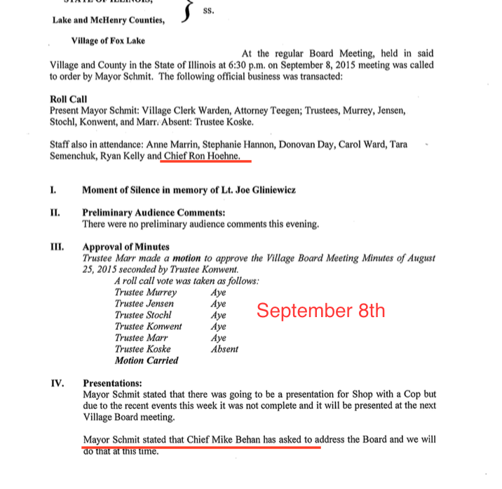 I think some of the writing was on the wall for Gliniewiscz when Police Chief Michael Behan was put on paid administrative leave about August 21st and I believe Lieutenant Mark Schindler was selected at that time to fill in for him while he was on leave. Then, when Behan quit a week later, it seemed like Schindler was the likely one to replace him at least until a real search for a new chief (if that was going to happen).