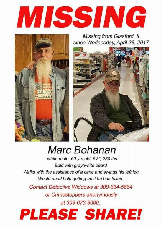 Locally, there are two prominent missing person cases. One is Robert Bee Jr., a 13-year-old Pekin boy who ran away from home in mid-November and hasn&#8217;t been seen since. The other is Marc Bohanan, 60, a Glasford man who has been missing since April 26 when he possibly left his home with another person.