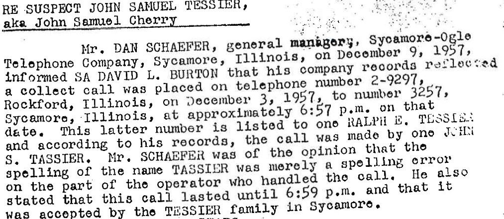 Image capture from the original FBI file detailing the phone call John Tessier made from Rockford to his home in Sycamore.