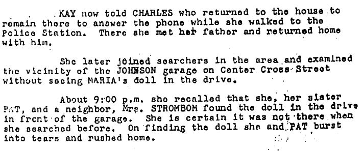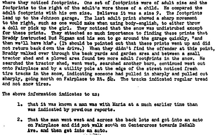 I'm not sure what point this is trying to make; I'm sure you can see how this is complete nonsense right? The driver of the oil truck said he saw the girls between 6:05 and 6:20pm or so, and did not see any other person with them. Neither did Maria's mom. How does the oil truck driver's testimony suggest Johnny was there earlier? Secondly, the cops weren't called until 8:10pm - so we're talking at least an hour after Maria went missing, during which time Maria's older brother and friends and Kathy plus others were walking around, stamping over any possible evidence while looking for her - oh, yeah, and it was snowing. I don't care if they had Sherlock friggen' Holmes on the case - no footsteps would have been remotely meaningful or useful. The idea that any footsteps at all would have been remotely meaningful is impossible.
