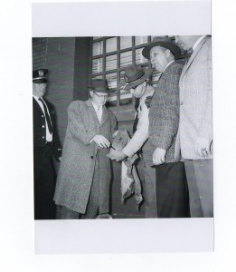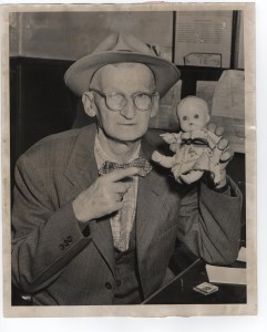 Photo 3: "Police Magistrate Arthur Ayars holds doll Maria was playing with just before she disappeared Tuesday evening. Doll was found abandoned near garage." Dec 5 - 1957