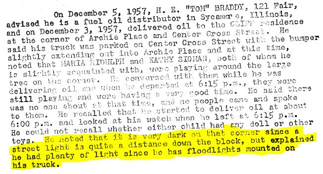 This is part of Mrs. Cliff's interview with police. She is the owner of the house on the corner where the girls were playing and she was receiving a load of oil from Tom Braddy...