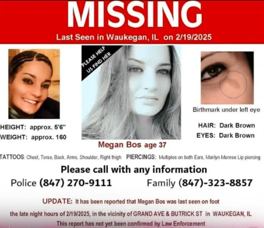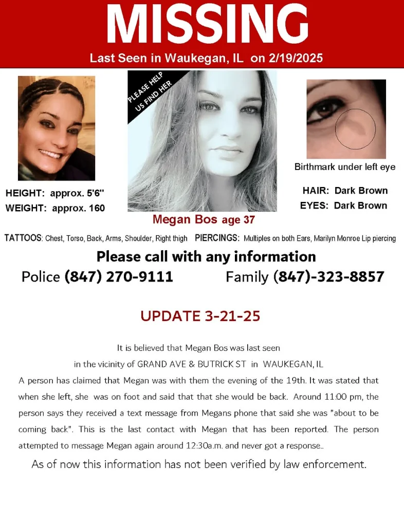 ANTIOCH, Ill. (March 13, 2025) — The Village of Antioch Police Department is asking for the public’s assistance in locating a 37-year-old local resident. Megan Bos was last heard from by family members on February 17, 2025. She was reported missing to the Antioch Police Department this week.