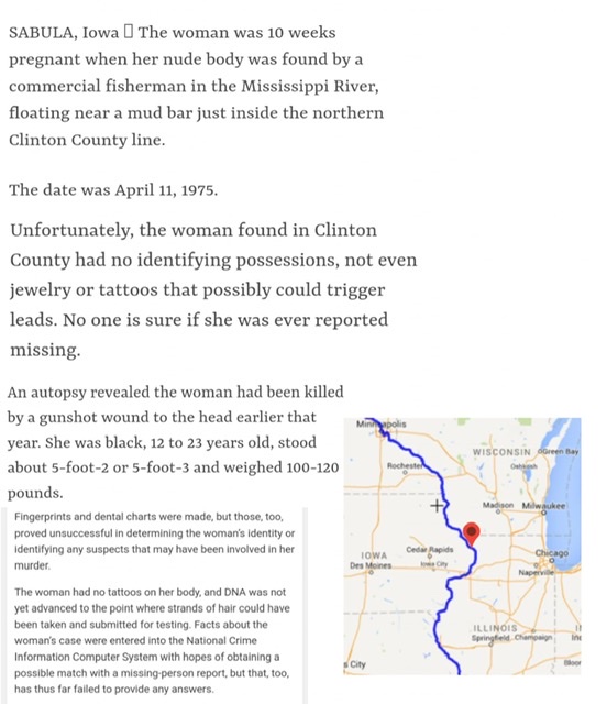 Could she possibly have been pregnant? Iowa has a Jane doe found in the Mississippi River near Clinton Iowa. Found in 1975 and believed to be between 12-22 years old. Older detectives thought she might have been from Chicago or Milwaukee.