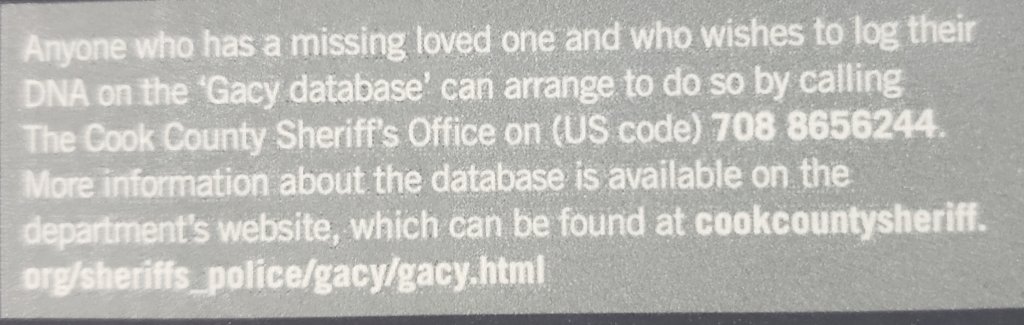 That's great to hear. Thank you for contacting them! I went on DDP's website last night and saw that they have the option to sponsor a specific UID among the current Does they have on their website. I'd highly consider sponsoring one of the Gacy cases. It's been so many years, they deserve to be reunited with their families.