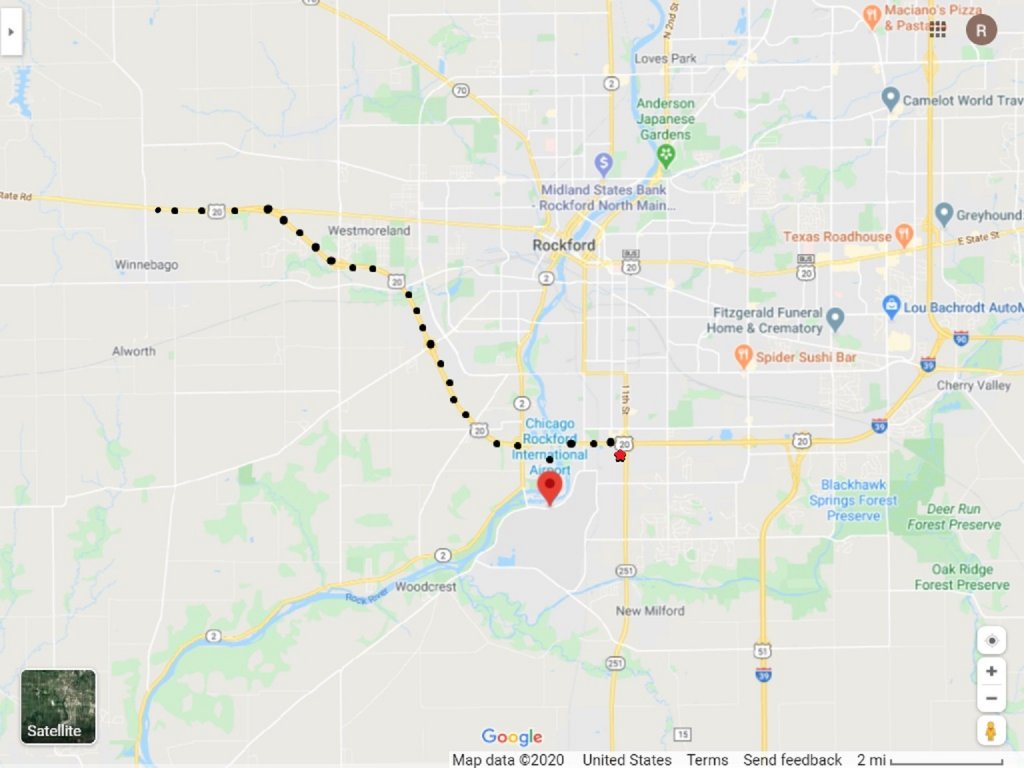 I read on one site that there was an airport in Rockford. I'm wondering if Amy bought the " kid snacks " ( crackers & milk ) at Sullivans grocery for Timmothy , who was asleep in the back seat of her car , to give him something to eat for his plane trip . As you can see from Winnebago she went straight by the airport before checking into the Rockford Inn ( red star ) , she maybe finally connected with people collecting Timmothy at the Airport who left on a flight that evening between 9 pm and 10:30 pm May 13 from Rockford to wherever , before checking into Rockford Inn about 11:30 pm for the end of her wild 3-day freeway trip and also the end of her life . Hopefully the police have checked with the airport for May 13 to see what flights were going where at that time in the evening that registered a young male child with them.