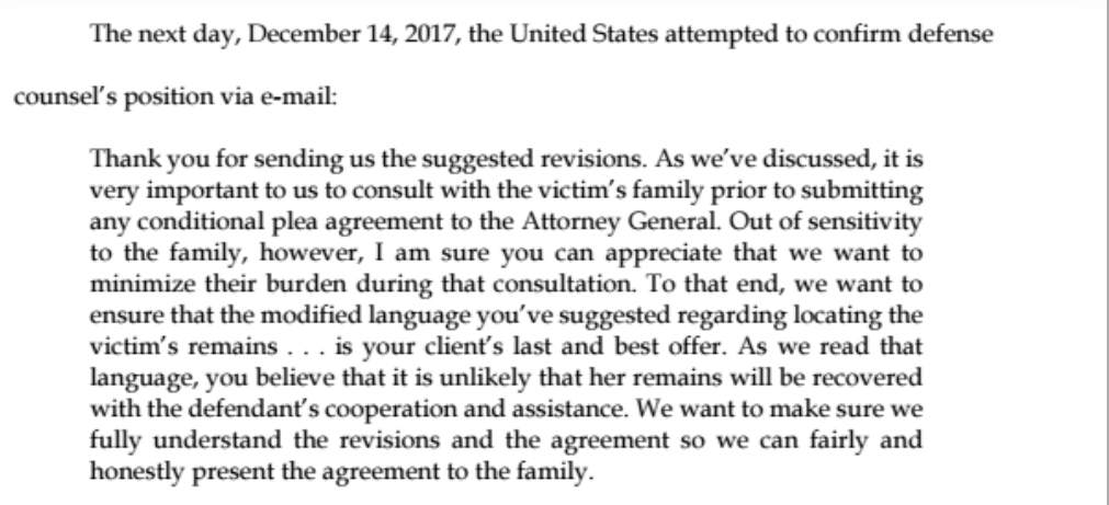 Thank you for sending us the suggested revisions. As we’ve discussed, it is very important to us to consult with the victim’s family prior to submitting any conditional plea agreement to the Attorney General. Out of sensitivity to the family, however, I am sure you can appreciate that we want to minimize their burden during that consultation. To that end, we want to ensure that the modified language you’ve suggested regarding locating the victim’s remains . . . is your client’s last and best offer. As we read that language, you believe that it is unlikely that her remains will be recovered with the defendant’s cooperation and assistance. We want to make sure we fully understand the revisions and the agreement so we can fairly and honestly present the agreement to the family