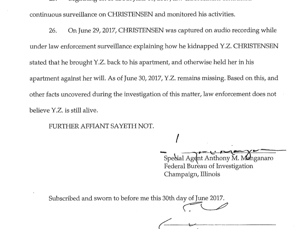 Authorities said they think Zhang is no longer alive based on audio FBI agents heard of Christensen, under surveillance Thursday, describing how he kidnapped her and what the bureau described only as “other facts uncovered during the investigation of this matter.”