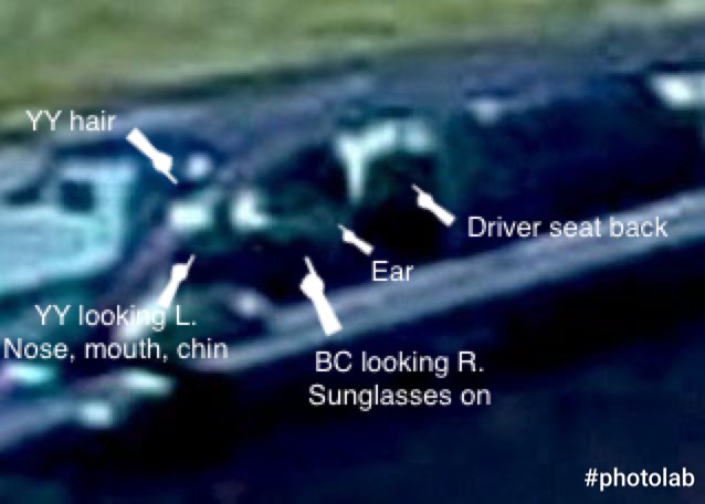 I don't know if this helps. I've tried to circle where I see YY. Is BC wearing a hoodie? He looks like he is either looking over at the back seat or at YY. I can't tell.