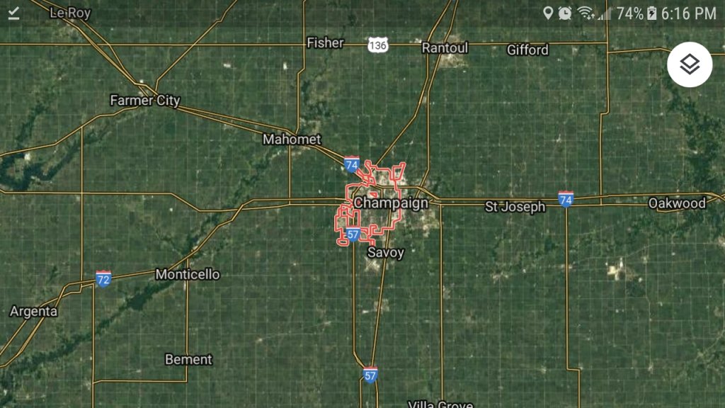 BC's Astra probably averaged about 30 miles per gallon. Kickapoo SP is 30 miles to the east on this map. Clinton Lake SP about 30 miles to the west. Allerton Park is 30 miles southwest.