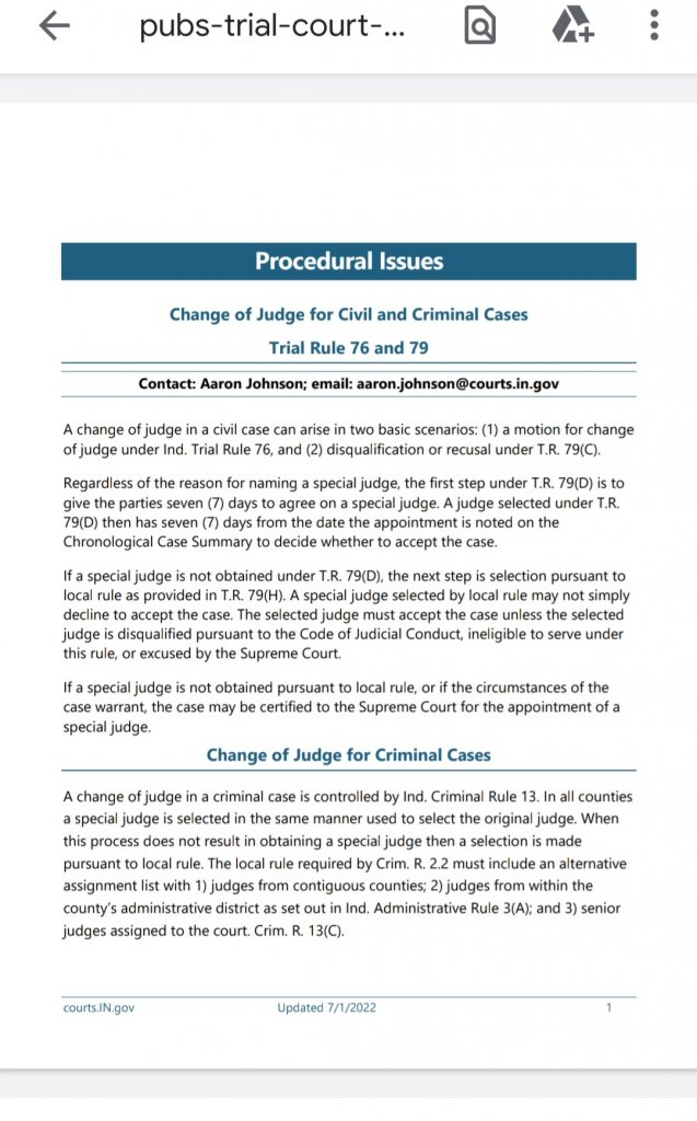 The use of video is pretty wide open, as you can see from the link I posted. The judge can decide to hold the hearing via video on her own motion. If I recall correctly, and I don’t have my Trial Rule book to see when changes were actually made, but I think the video rules were relaxed substantially during the pandemic. I saw huge changes about holding hearings and conferences via video. We all thought we’d be “shut down” under the Governor’s Executive Order for a few weeks, and then it kept going. The courts couldn’t sit on their dockets for that long, and I think there was a scramble to write/rewrite the court rules for the use of video.