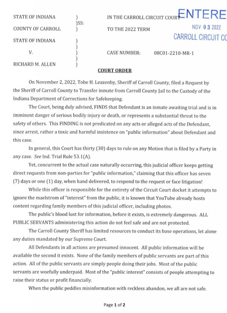 DELPHI, Ind. (WISH) — A man charged in the killings of two teenagers in 2017 will be moved from a county jail to a state facility. Carroll County Sheriff Tobe Leazenby filed a request Thursday to transfer Richard Allen to the Indiana Department of Corrections. That request was subsequently...www.wishtv.com