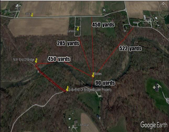 There are numerous maps posted on this thread that accurately reflect the gps coordinates of the location where the bodies were found. If you look directly south from the center of the cemetery property, at/in/just north of the creek/creek bed, is the crime scene.