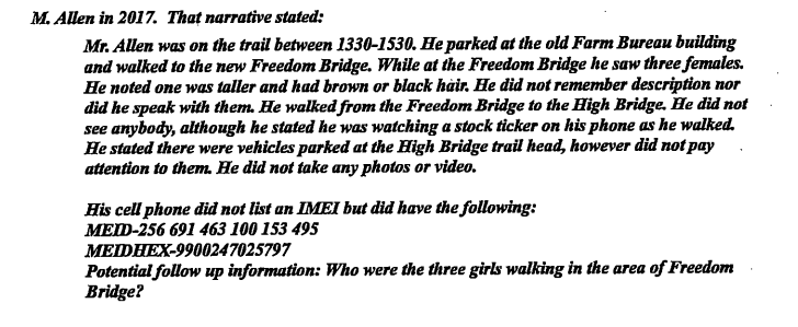 It's important, again, to see what RA's 2017 statement actually contained. He told them nothing of his clothing that day, or that he was on the bridge itself, only that he walked to it. From other reports, he supposedly talked to the CO while the girls were still missing. All RA really confessed to in 2017 was parking and walking on the trails from 1:30 to 3:30 that afternoon. I'm not making excuses for anyone, because once LE knew more about vehicles and who all the witnesses had seen within that time frame, his statement should have been revisited.