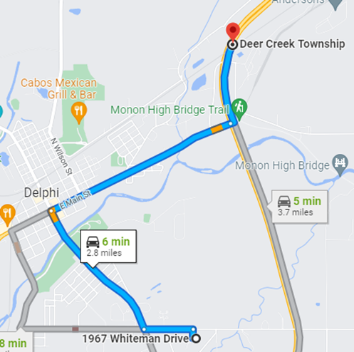 I've been wondering about this since I watched the one-time vid that MadMcGoo approved and posted upthread. RMA was coming from the east and driving west down W 300 N when he was seen on Hoosier Harvestore cam. Why would he come from that direction when the direct route from his house wouldn’t capture him traveling on W 300 N at ALL? (Deer Creek Township on the map is the approx. area of where the old CPA building was and where he parked).