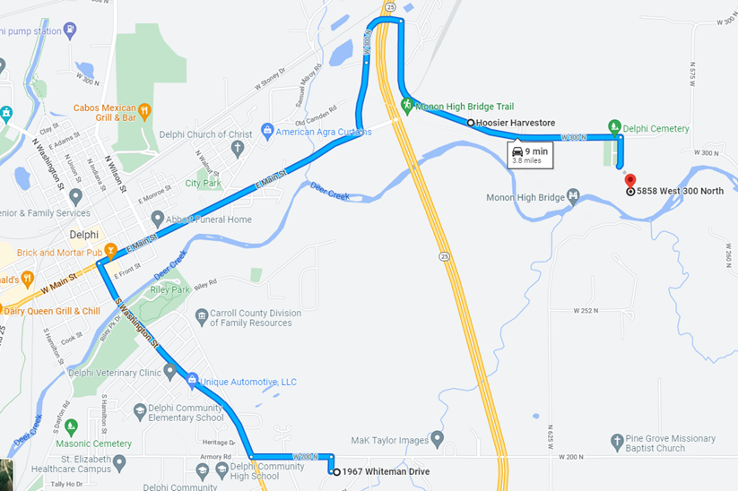 Yet he he was seen coming from the east. The only way to get to W 300 N from RMA’s house is to go pretty far east before you can go north on N 450 W since you can’t cross Deer Creek going north. I scrolled on the map and there’s not much east of town. However, RL’s house is east of the Hoosier Harvestore cam that RL was seen on at 1:27pm (1:47 mark in approved vid below) The red X marks where RL lived and the blue line shows you how far out of the way RMA would have had to drive to be seen traveling west on the cam if he had not taken the direct route to where he parked at the Old CPA. That’s pretty far out of the way when the direct route (above pic) makes more sense.