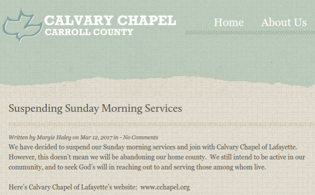 Link states services have been suspended (but does not list when this occurred) The nearest suggested Calvary church it suggest attending is in nearby Lafayette.
