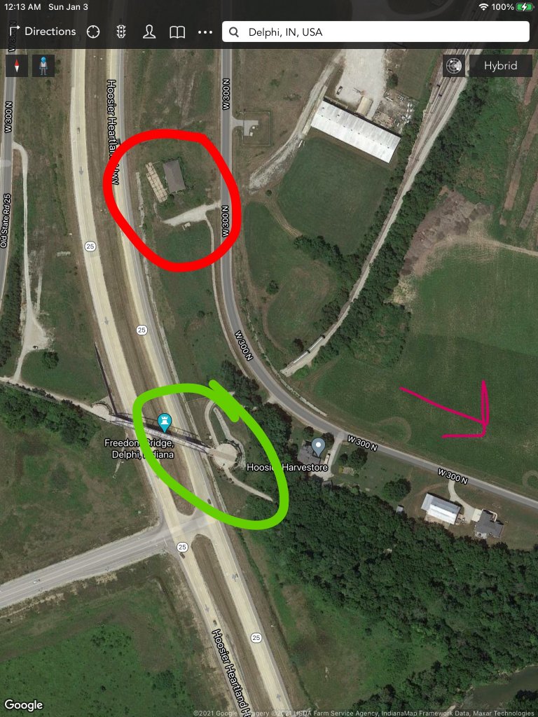When I was there in October, the leaves were still mostly on the trees. As I crossed FB, I was struck by the fact that where BG most likely parked a vehicle would not have been visible from the FB or either side of it along IN 25, as I've explained in more recent times, I think BG parked by the building for concealment purposes. The vehicle would have been seen by people driving on C.R. 300 or maybe nearby neighbors, there are some properties on the south side of C.R. 300 very close to where the building stood.