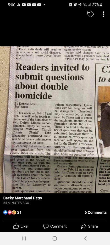Anyone with information about this case, no matter how insignificant, is encouraged to call the Delphi Homicide Investigation Tip Line at (844) 459-5786.