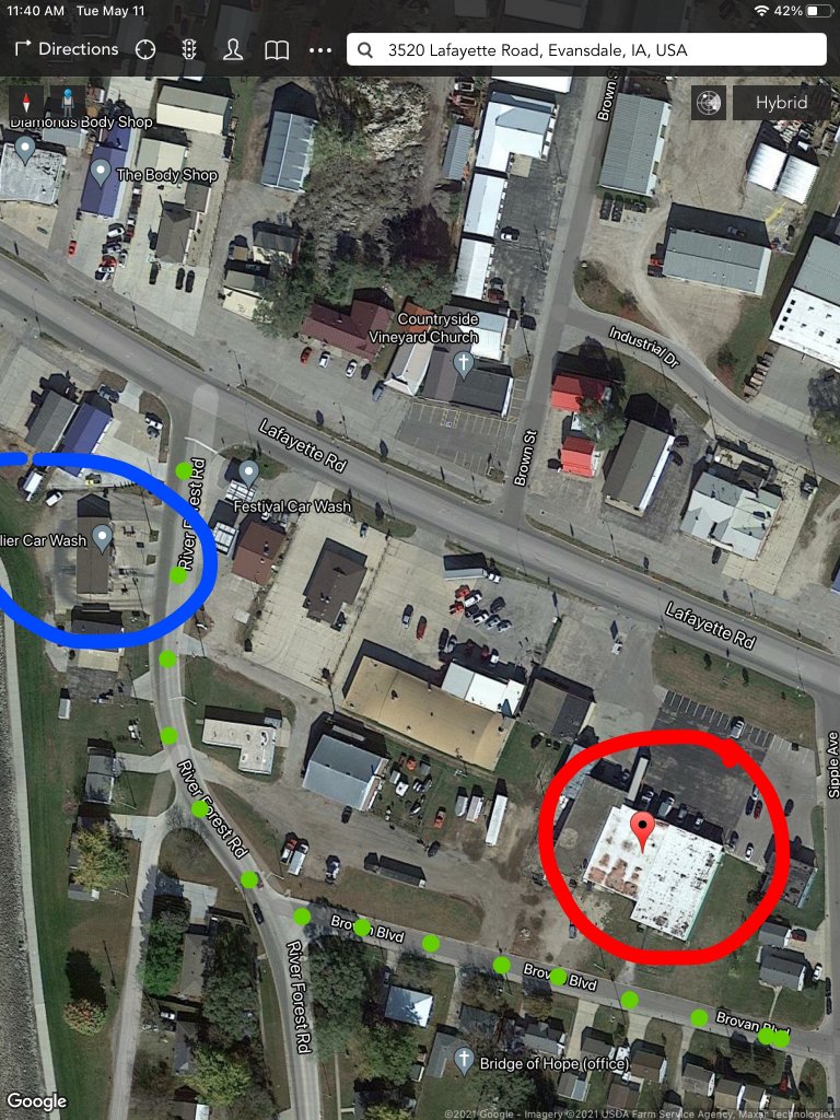 On the map, the red circled building is 3520 Lafayette Road in Evansdale, the building referenced above with the security camera video that saw the girls pass on bikes. The camera was behind the building so