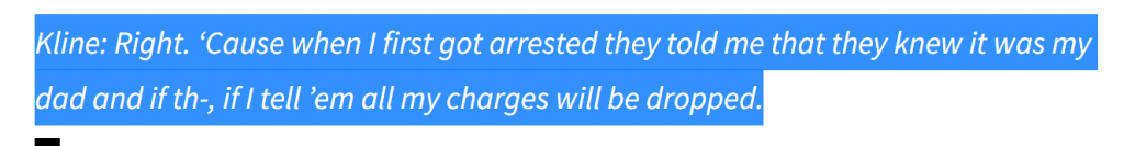 Kline responds, “I have no clue. I don’t know. Probably because they D.N.A tested me.”