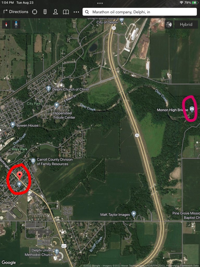 Wonder if Deer Creek if passable on a jet ski from the gas station to Monon High Bridge? Rilley Park Drive would be a good place to pull a kayak out of the water after downstreaming from Monon High Bridge. The Kayak would have to have been placed near the cemetery and hidden in the woods earlier. I forget his name but that one fellow that is in jail for another abduction in a nearby city was into kayaking and had even done Deer Creek I believe.