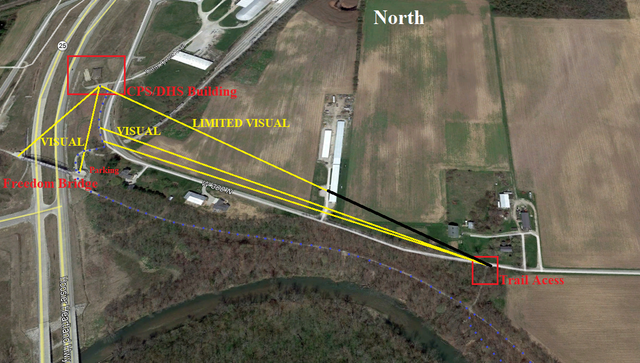 Here is a map (Google Earth 4/17), that shows some possible visuals anyone could have had, if parked at the CPS/DHS building (now demolished) and walked towards the N/W Trailhead/ Freedom Bridge. Not saying it may have been relevant, but it could be one more piece of showing how well planned the attack really was IMO.